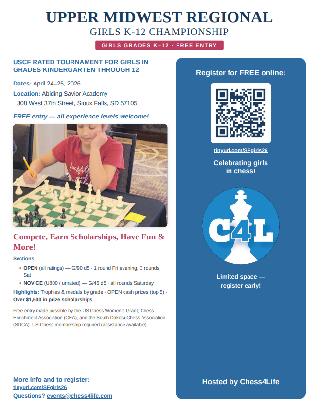 We are in need of more tournament directors, sponsors and help to put on tournaments throughout South Dakota. Please contact Dustin Ferguson at dustinferguson24@gmail.com if interested in helping with future tournaments, providing supplies or venues for future tournaments. South Dakota chess is growing, but we need your help to continue to foster chess education and growth in this great state!