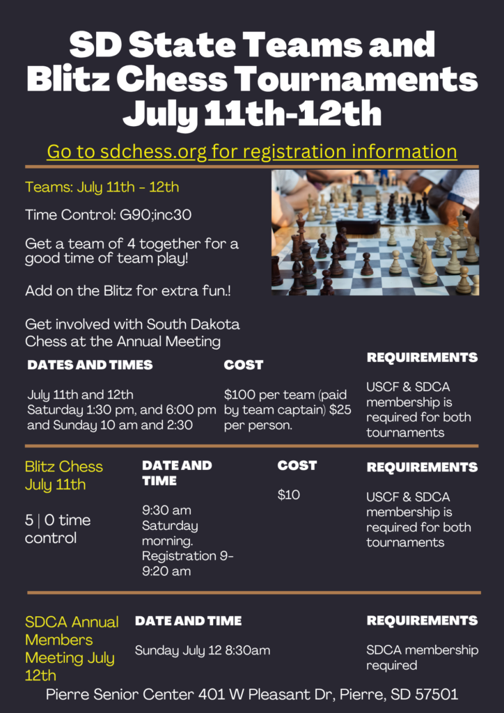 The sdchess.org website is home to the South Dakota Chess Association (SDCA). SDCA is a not for profit organization based in South Dakota, USA. SDCA is the official USCF affiliate for the state of South Dakota and is led by a core of volunteers to promote the game in the state and beyond.
