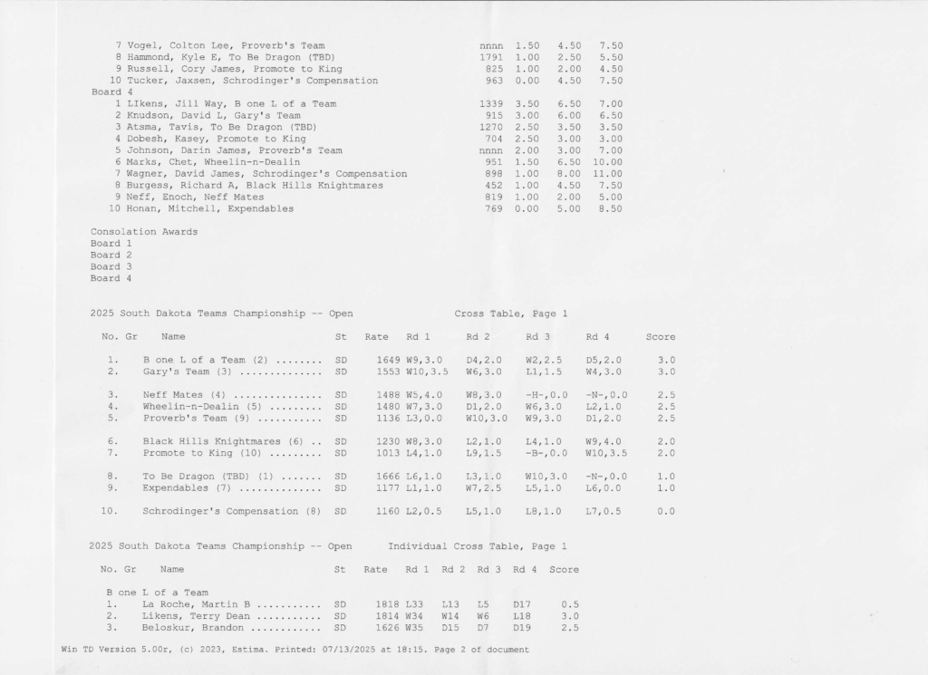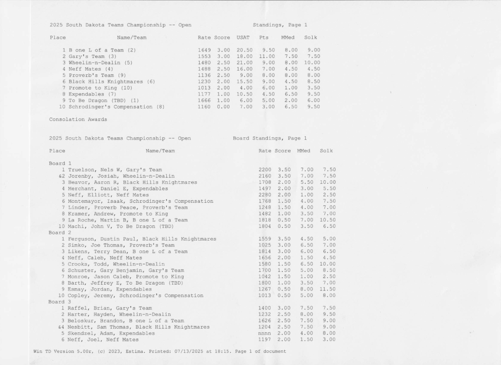 Congratulations to all our champions! This year brought an impressive upset as unrated player Adam Kostas claimed the title of 2025 South Dakota Chess Champion with a flawless 5–0 score. National Master Josiah Jorenby secured second place, followed by Kunyang Li in third.